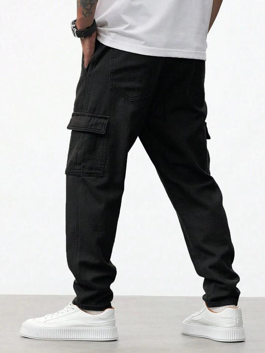 MQ Denim Men's Wide Leg 6-Pocket Cargo Mid Rise Black Jeans, Non-Stretchable and Pure Cotton Denim. Trendy and Comfortable Casual Wear