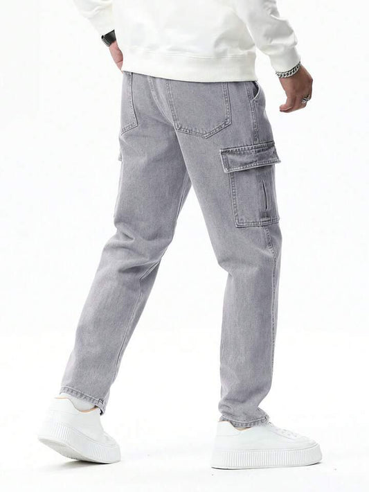 MQ Denim Men's Wide Leg 6-Pocket Cargo Mid Rise Grey Jeans, Non-Stretchable and Pure Cotton Denim. Trendy and Comfortable Casual Wear