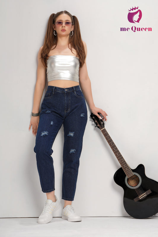 MeQueen Women's Police Blue Fit Ripped Distrssed Denim Jeans