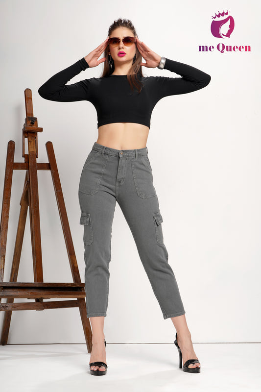 MeQueen Women's Black Fit Cargo Jeans with 4 Flap Pockets