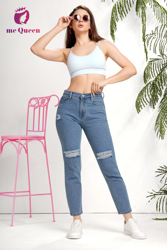 MeQueen Women's Sky Blue Fit Ripped Knee Jeans