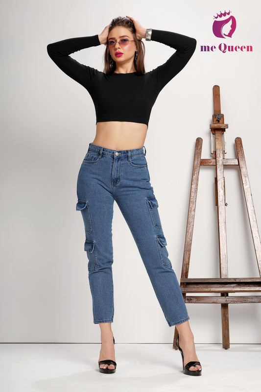 MeQueen Women's Deep Blue Fit Cargo Jeans with 4 Flap Pockets