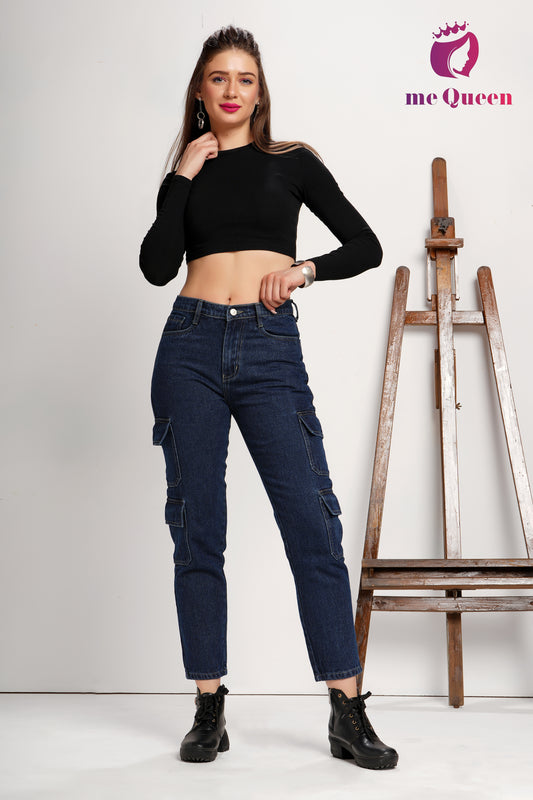 MeQueen Women's Midnight Navy Fit Cargo Jeans with 4 Flap Pockets