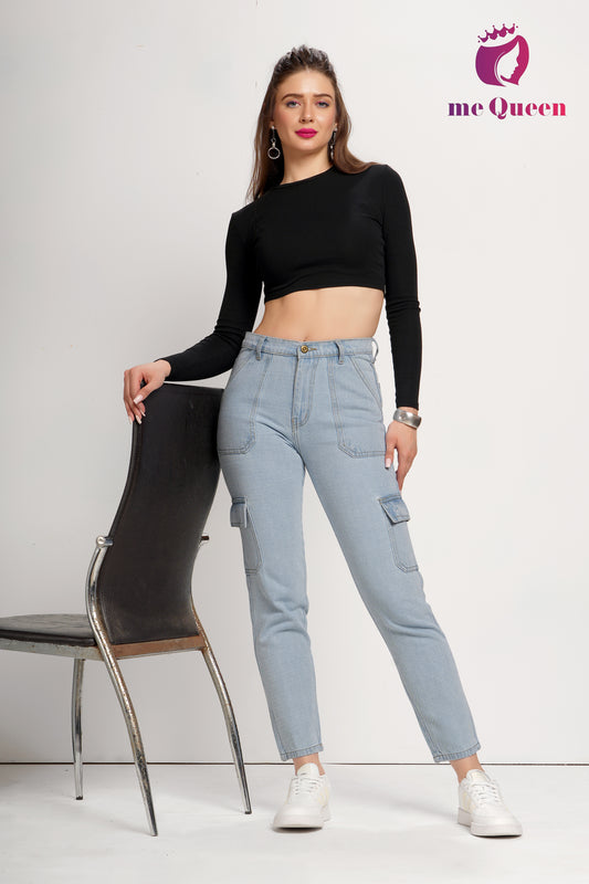 MeQueen Women's Sky Blue Fit Cargo Jeans with 2 Flap Pockets