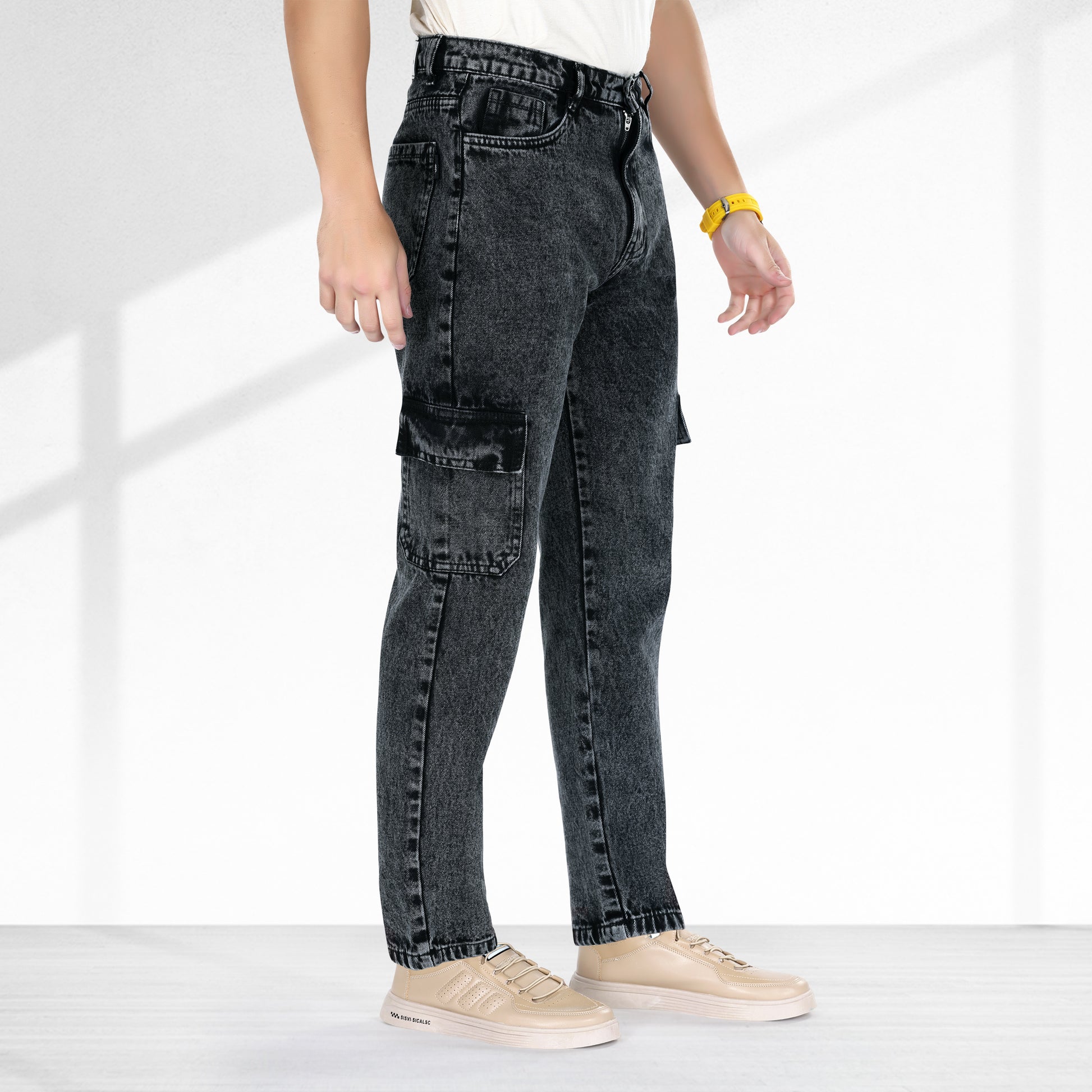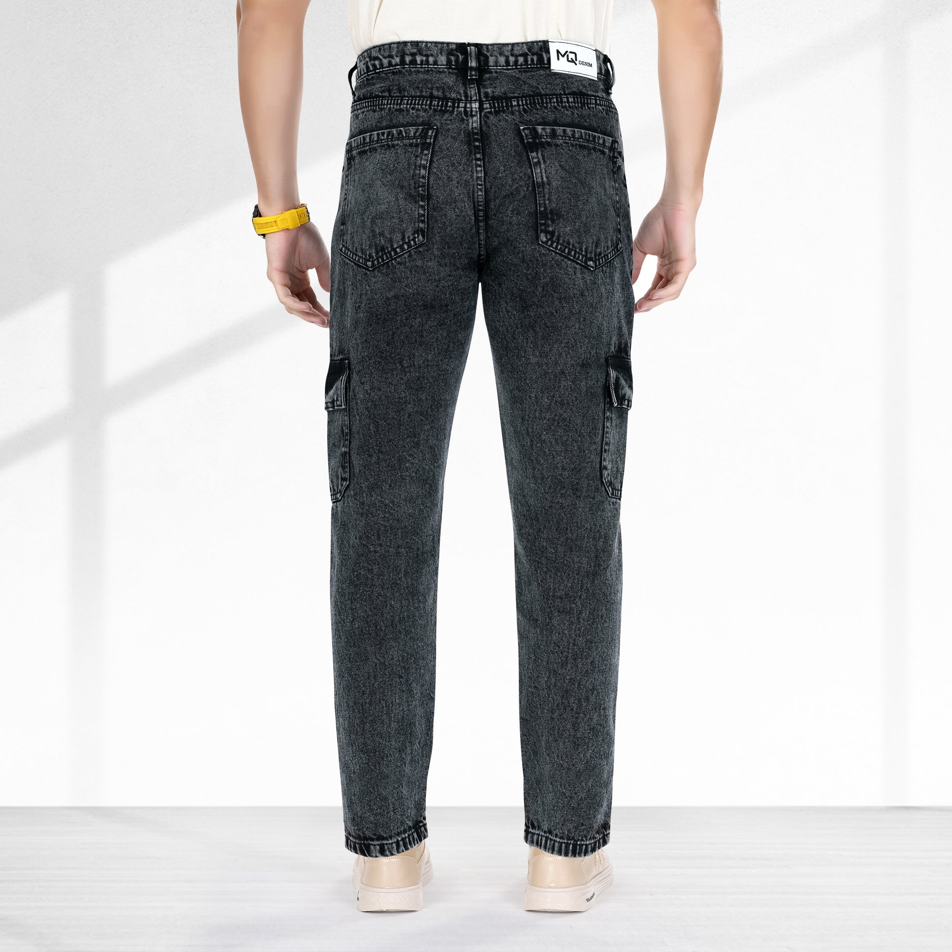 MQ Denim Men's Tapered Fit 6-Pocket Cargo Mid Rise Charcoal Black Jeans, Non-Stretchable and Pure Cotton Denim. Trendy and Comfortable Casual Wear.