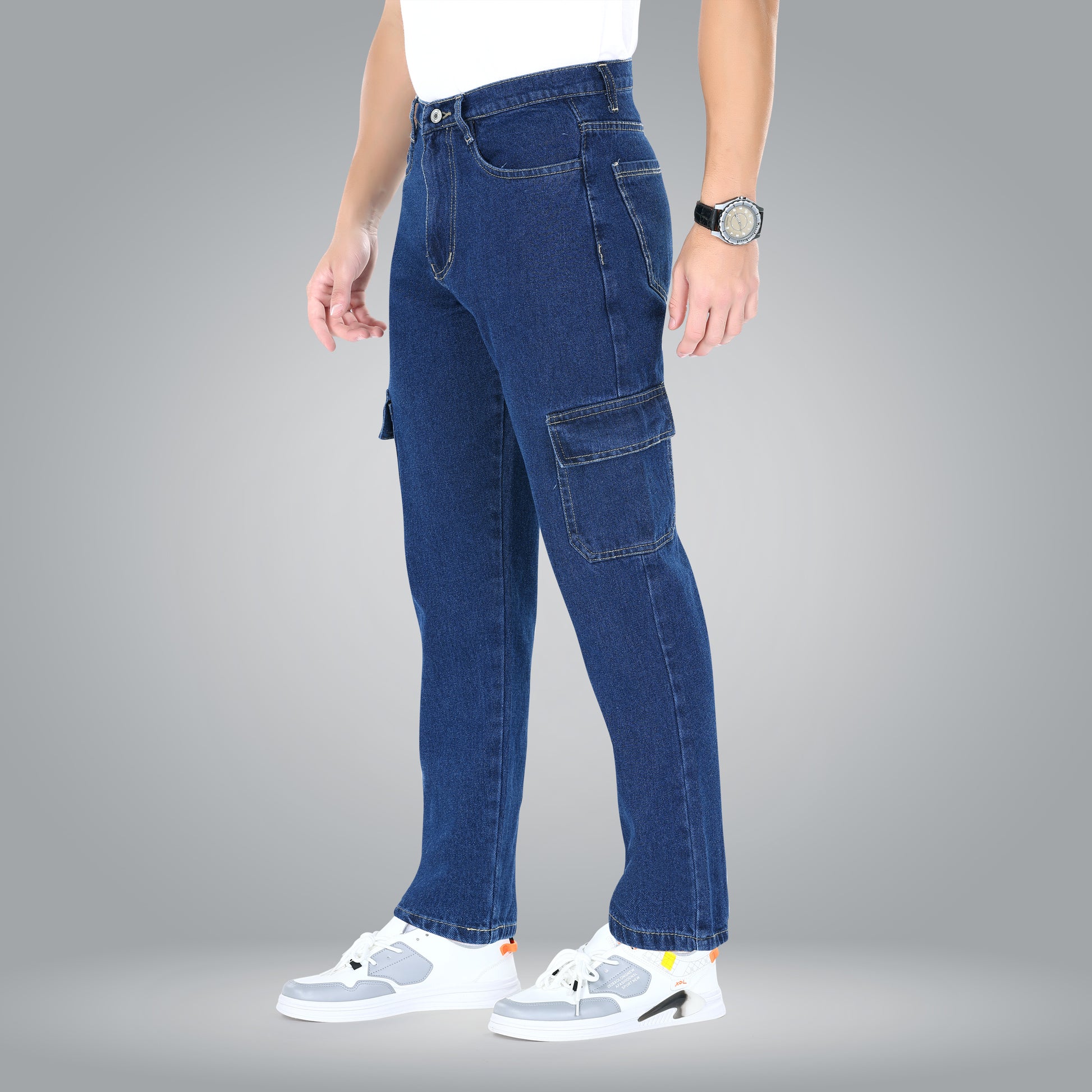 MQ Denim Men's Tapered Fit 6-Pocket Cargo Mid Rise Dark Blue Jeans, Non-Stretchable and Pure Cotton Denim. Trendy and Comfortable Casual Wear.