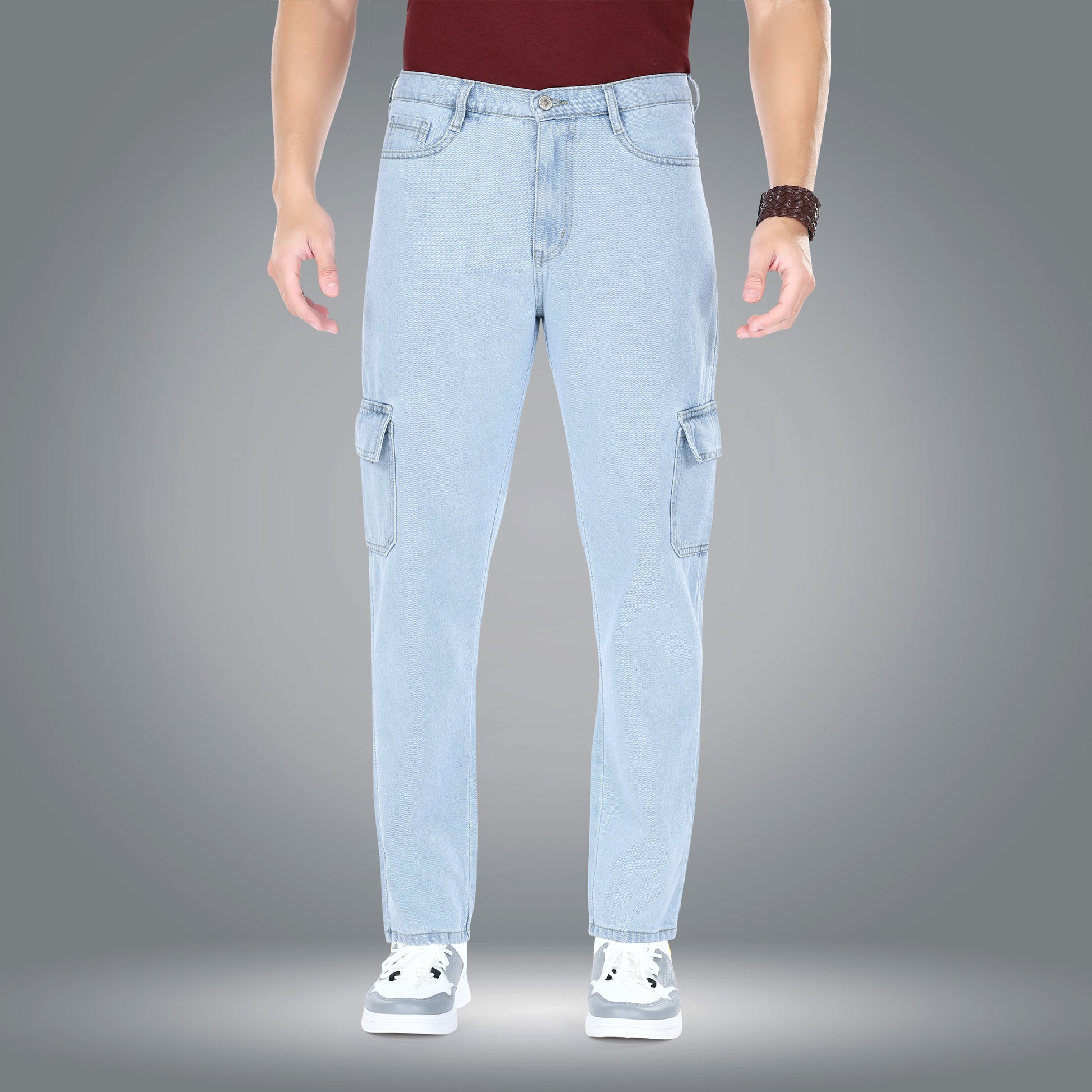 MQ Denim Men's Tapered Fit 6-Pocket Cargo Mid Rise Ice Blue Jeans, Non-Stretchable and Pure Cotton Denim. Trendy and Comfortable Casual Wear.